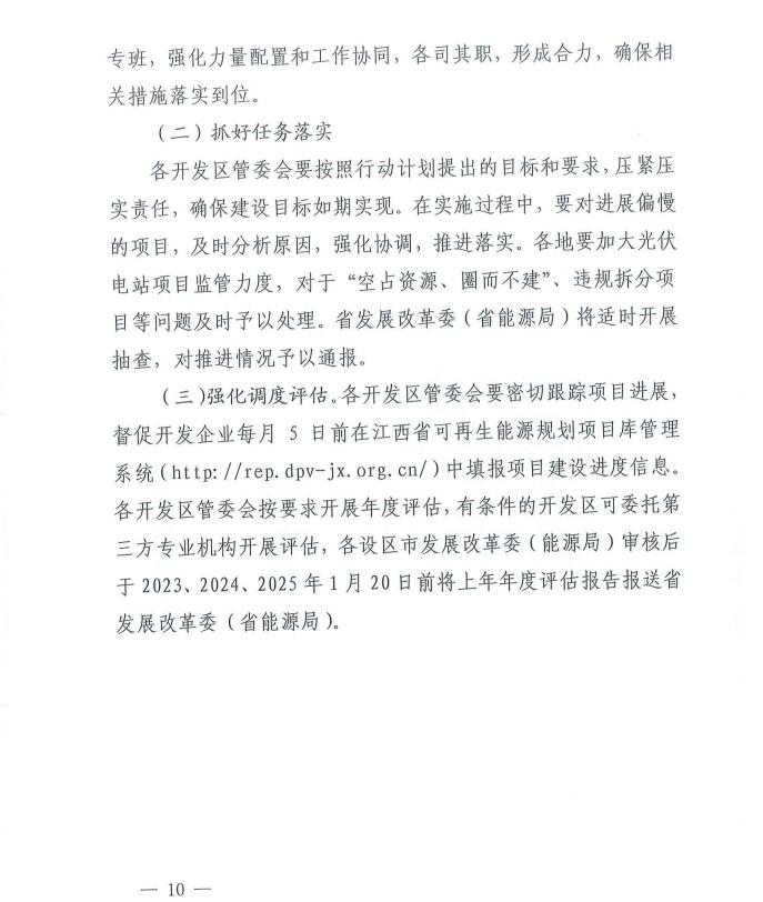 為深入貫徹碳達(dá)峰、碳中和重大戰(zhàn)略決策,加快發(fā)展可再生能源,實(shí)施可再生能源替代行動,提升我省開發(fā)區(qū)能源自供給能力,我委編制了《江西省整體推進(jìn)開發(fā)區(qū)屋頂光伏建設(shè)三年行動計(jì)劃( 2022-2024年)》,經(jīng)委主任辦公會審議通過后印發(fā)給你們,請認(rèn)真貫徹執(zhí)行。各設(shè)區(qū)市發(fā)展改革委(能源局)于3月10日前將轄區(qū)內(nèi)各省級以上開發(fā)區(qū)開發(fā)方案報(bào)送我委。
