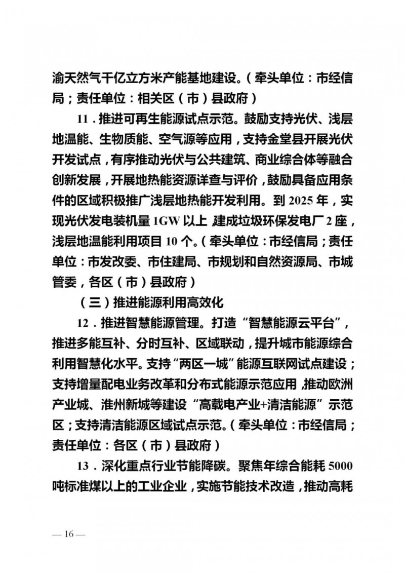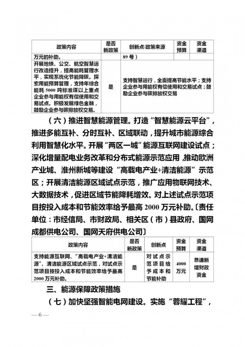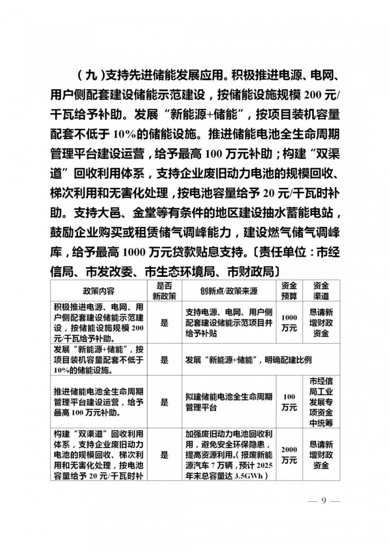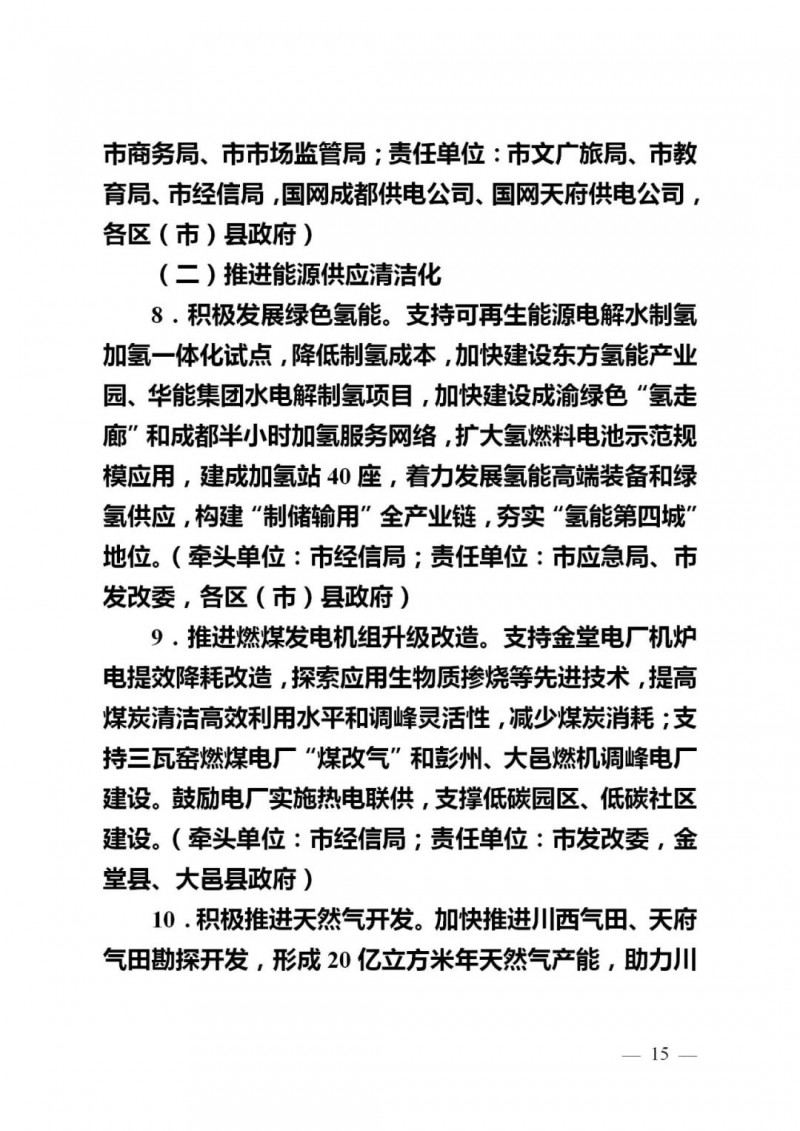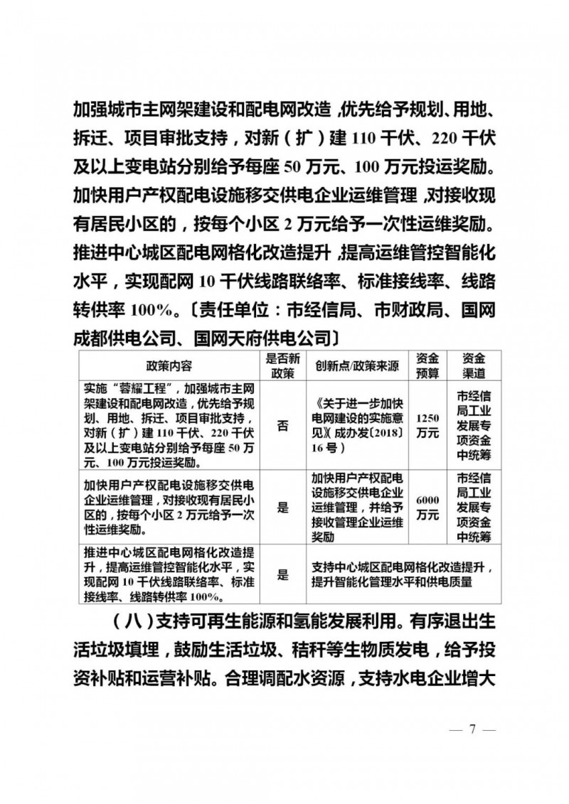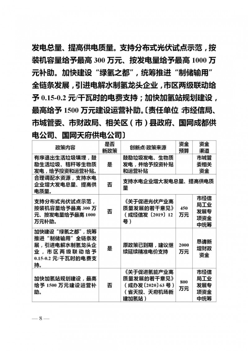 文件明確,支持可再生能源和氫能發(fā)展利用。有序退出生活垃圾填埋,鼓勵(lì)生活垃圾、秸稈等生物質(zhì)發(fā)電,給予投資補(bǔ)貼和運(yùn)營(yíng)補(bǔ)貼。合理調(diào)配水資源,支持水電企業(yè)增大發(fā)電總量、提高供電質(zhì)量。支持分布式光伏試點(diǎn)示范,按裝機(jī)容量給予最高300萬(wàn)元、按發(fā)電量給予最高1000萬(wàn)元補(bǔ)助。加快建設(shè)“綠氫之都”,統(tǒng)籌推進(jìn)“制儲(chǔ)輸用”全鏈條發(fā)展,引進(jìn)電解水制氫龍頭企業(yè),市區(qū)兩級(jí)聯(lián)動(dòng)給予0.15-0.2元/千瓦時(shí)的電費(fèi)支持;加快加氫站規(guī)劃建設(shè),最高給予1500萬(wàn)元建設(shè)運(yùn)營(yíng)補(bǔ)助。