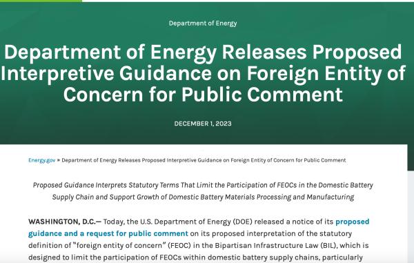 12月1日,美國能源部(DOE)發(fā)布《兩黨基礎(chǔ)設(shè)施法》中 “敏感外國實體(Foreign Entity of Concern,F(xiàn)EOC)”的解釋文件。同日,美國財政部(Treasury)和國稅局(IRS)發(fā)布了《通貨膨脹削減法》(IRA)第30D條清潔能源車輛稅收抵免相關(guān)禁令的指導(dǎo)意見。