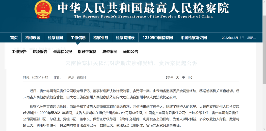 近日,貴州電網(wǎng)有限責(zé)任公司原黨組書記、董事長(zhǎng)唐斯慶涉嫌受賄罪、貪污罪一案,由云南省監(jiān)察委員會(huì)調(diào)查終結(jié),移送檢察機(jī)關(guān)審查起訴。經(jīng)云南省人民檢察院指定管轄,由大理白族自治州人民檢察院依法向大理白族自治州中級(jí)人民法院提起公訴。