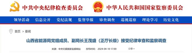中央紀(jì)委國家監(jiān)委網(wǎng)站4月10日,據(jù)山西省紀(jì)委監(jiān)委消息:山西省能源局黨組成員、副局長王茂盛(正廳長級(jí))涉嫌嚴(yán)重違紀(jì)違法,目前正接受山西省紀(jì)委監(jiān)委紀(jì)律審查和監(jiān)察調(diào)查。