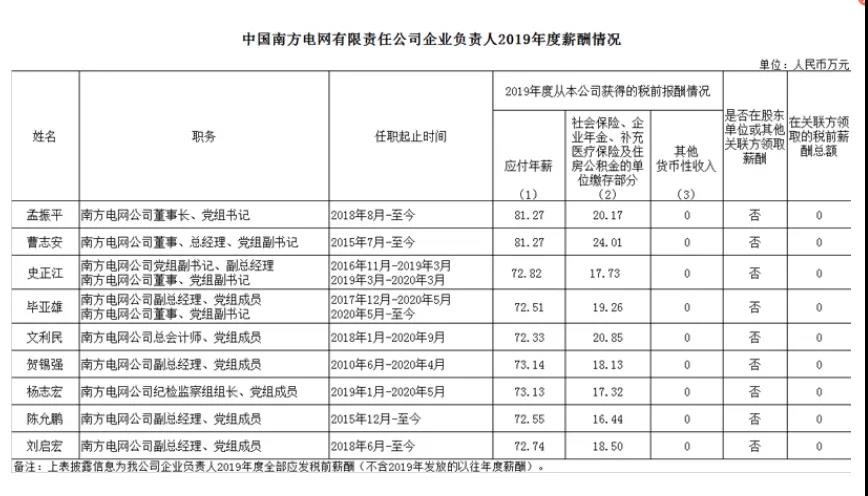 中國電力網(wǎng)(微信公眾號(hào):China_Power_com_cn)獲悉,近日,國家電網(wǎng)、南方電網(wǎng)、華能集團(tuán)、國家能源集團(tuán)、中廣核、中國能建、中國電建等能源電力央企發(fā)布了企業(yè)負(fù)責(zé)人2019年度薪酬情況。