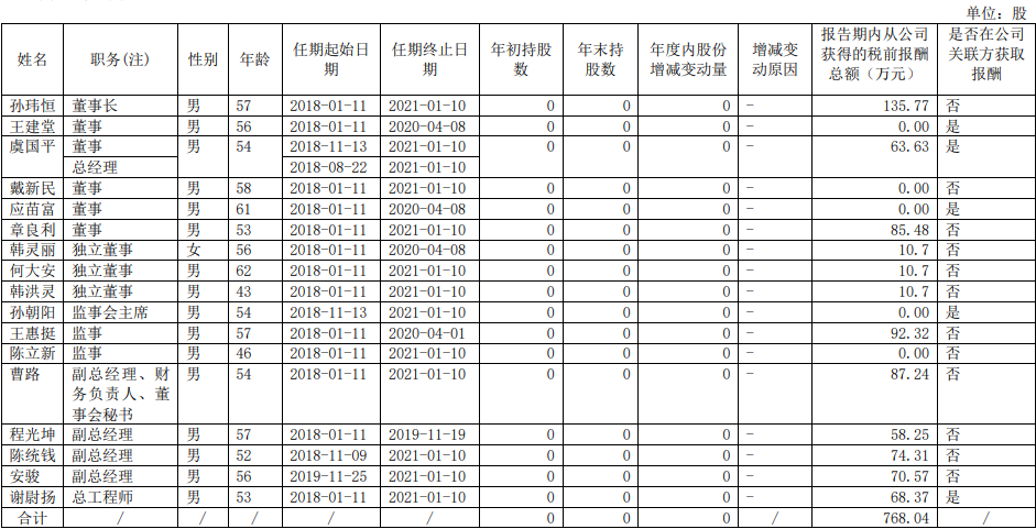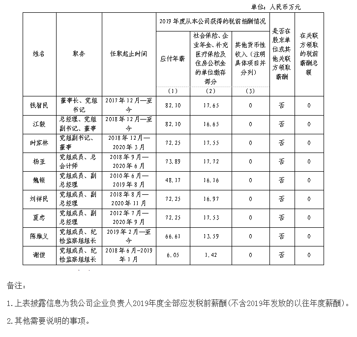 浙江浙能電力股份有限公司企業(yè)負(fù)責(zé)人2019年度薪酬情況