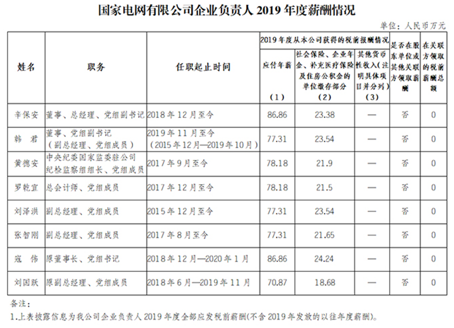 其中,以國家電網(wǎng)總經(jīng)理、黨組副書記辛保安86.86萬元年薪為最高,時(shí)任國家電網(wǎng)董事長、黨組書記寇偉年薪同樣是86.86萬元。其次為華能集團(tuán)黨組書記、董事長舒印彪年薪82.12萬元。
