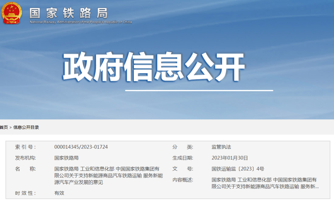 國家鐵路局 工業(yè)和信息化部 中國國家鐵路集團(tuán)有限公司關(guān)于支持新能源商品汽車鐵路運(yùn)輸 服務(wù)新能源汽車產(chǎn)業(yè)發(fā)展的意見