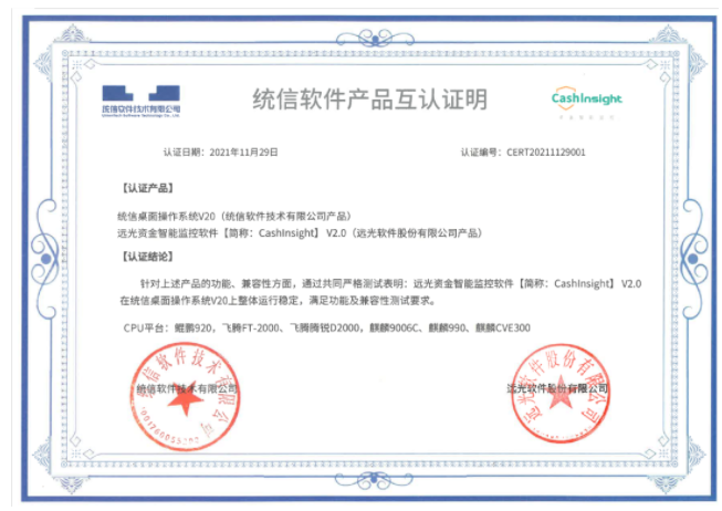 近日,遠光軟件自主研發(fā)的分析型軟件產(chǎn)品資金智能監(jiān)控軟件CashInsightV2.0與國產(chǎn)操作系統(tǒng)廠商統(tǒng)信軟件推出的統(tǒng)信桌面操作系統(tǒng)V20完成產(chǎn)品兼容互認證。測試結(jié)果表明,CashInsight V2.0在功能、兼容性方面整體運行穩(wěn)定,滿足認證要求。標志著遠光軟件在支持國產(chǎn)軟件兼容適配方面再下一城,支撐能力不斷加強。