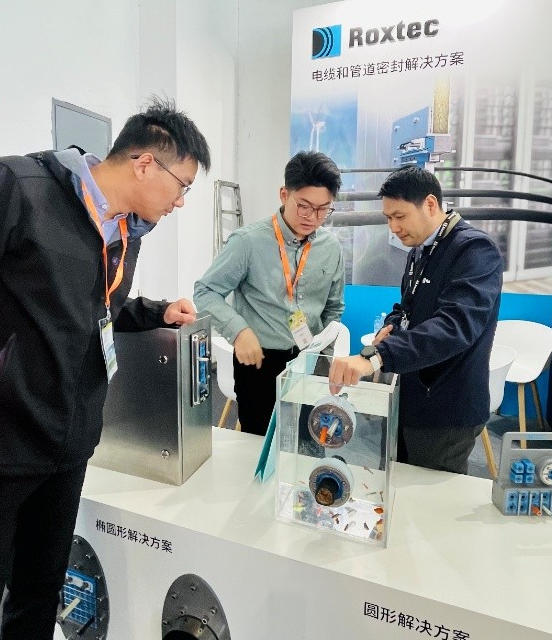 大批風電設備制造商、開發(fā)商及技術專家蒞臨參觀。國內某風電整機廠技術專家表示:“以往項目中,不同規(guī)格管線要匹配不同密封件,選型、庫存管理都很繁瑣,Roxtec多徑技術直接解決了這個痛點,對提升安裝效率很有幫助。”