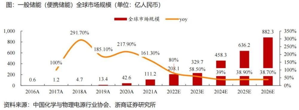 一般儲能/便攜儲能:適用于①戶外旅行場景,為手機(jī)/電腦等供電,滿足戶外旅行多樣化便攜需求;②應(yīng)急備災(zāi)等場景,在地震、海嘯多發(fā)地區(qū),可與太陽能電板構(gòu)成小型發(fā)電系統(tǒng),滿足災(zāi)民用電需求。根據(jù)中國化學(xué)與物理電源行業(yè)協(xié)會數(shù)據(jù),預(yù)計(jì)至2026年市場規(guī)模有望達(dá)882億人民幣。具體如下圖所示: