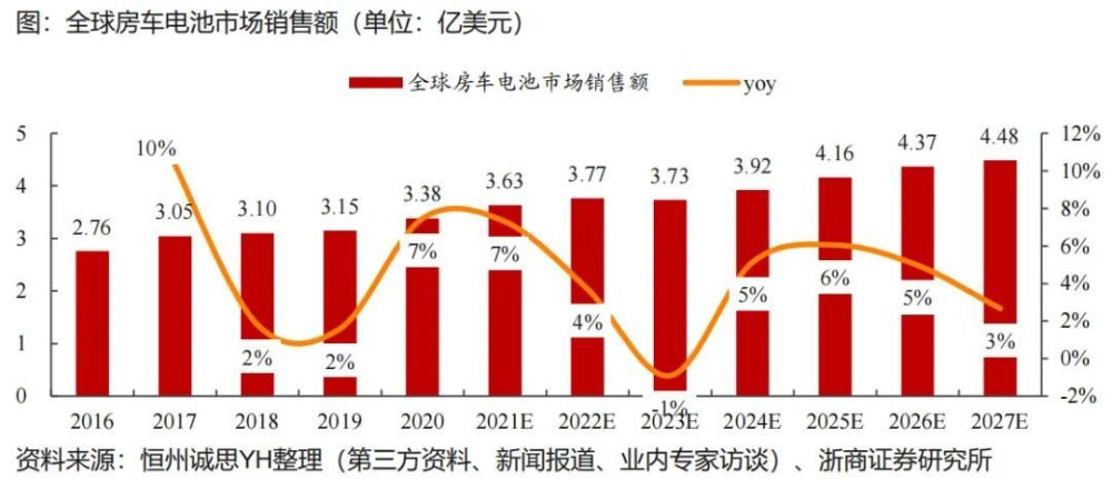 房車儲能:鉛酸電池儲能系統(tǒng)相對成熟,已被成品房車大量使用;近幾年趨勢會加配折疊太陽能電池板,備用發(fā)電。根據(jù)恒州誠思數(shù)據(jù),預(yù)計(jì)2026年房車用電池市場銷售額4.37億美元;伴隨儲能系統(tǒng)迭代升級,房車儲能有較大機(jī)會。具體如下圖所示: