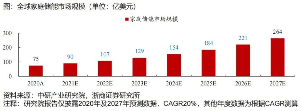 家庭儲能:由于海外電價昂貴+電網(wǎng)穩(wěn)定性有待提升,根據(jù)中研產(chǎn)業(yè)研究院發(fā)布,2020年全球家庭儲能規(guī)模約75億美元,預(yù)計(jì)至2027年達(dá)264億美金,cagr20%。具體如下圖所示: