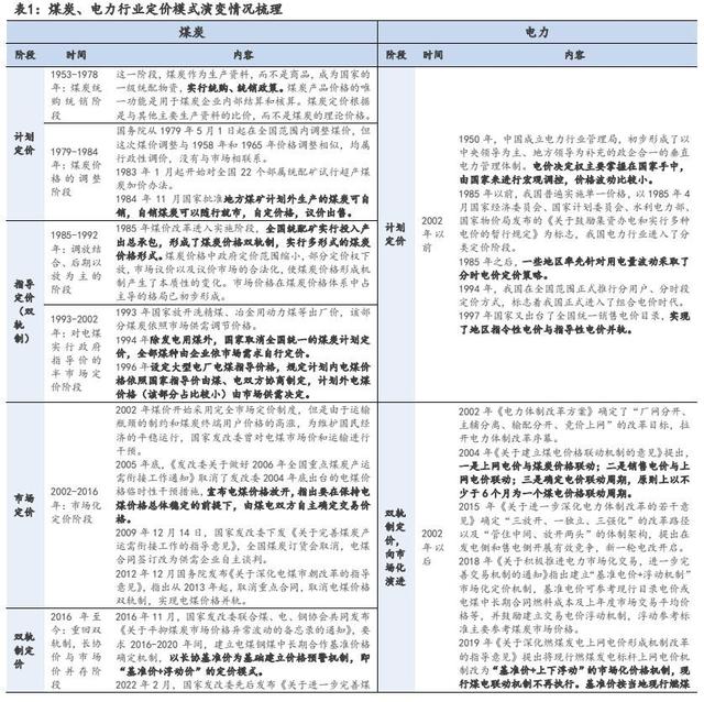 煤電矛盾的本質(zhì)是煤、電定價機制市場化程度不同。煤炭定價方面,2016 年以前我國煤炭價格經(jīng)歷了計劃價格、指導(dǎo)價格、市場價格等多種定價機制。2016 年末國家發(fā)改委聯(lián)合煤、電、鋼協(xié)會共同發(fā)布《關(guān)于平抑煤炭市場價格異常波動的備忘錄的通知》,要求 2016-2020 年間,建立電煤鋼煤中長期合作基準(zhǔn)價格確定機制,以長協(xié)基準(zhǔn)價為基礎(chǔ)建立價格預(yù)警機制,即“基準(zhǔn)價+浮動價”的定價模式。電力定價方面,2015 年國家開啟電力定價機制市場化改革,2020 年取消“煤電聯(lián)動”機制,同時將燃煤發(fā)電標(biāo)桿上網(wǎng)電價機制改為“基準(zhǔn)價+上下浮動”的市場化價格機制,基準(zhǔn)價格設(shè)定權(quán)下放至地方政府,浮動幅度由電力用戶等市場主體協(xié)商決定。
