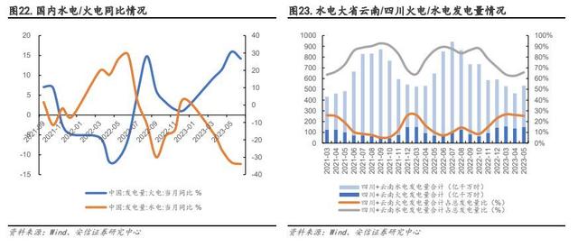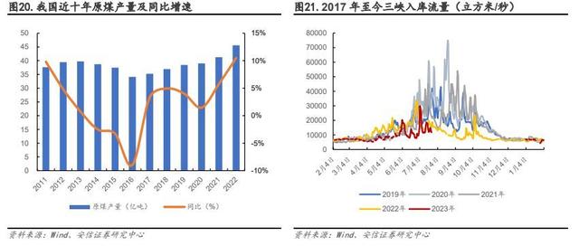 確保能源安全穩(wěn)定供應(yīng),煤電扛起保供重任。2023 年 4 月《2023 年能源工作指導(dǎo)意見》發(fā)布,不同于 2021 年指導(dǎo)意見中將“能源結(jié)構(gòu)”放在了目標(biāo)首位,國家能源局已經(jīng)連續(xù)兩年堅持把“增強供應(yīng)保障能力”放在主要目標(biāo)首位。由此可見,自 2021 年起頻發(fā)的缺電事件使人們意識到能源保供需求刻不容緩,而我國以煤為主的資源稟賦,決定了煤電在相當(dāng)長時期內(nèi)仍將承擔(dān)保障我國能源安全的重要作用。從數(shù)據(jù)來看,煤炭方面,在能源保供要求下國家通過核增產(chǎn)能、擴產(chǎn)、新投產(chǎn)等方式持續(xù)新增煤炭產(chǎn)能,據(jù)國家統(tǒng)計局,2022 年我國實現(xiàn)煤炭產(chǎn)量 45.6 億噸,同比增長 10.5%,為近十年來最高增速。煤電方面,去年夏季以來,降水偏枯造成水電發(fā)電量持續(xù)出力不足,2022 年下半年至 2023 年上半年三峽水庫日均流入量為近五年來同期低位,據(jù)國家統(tǒng)計局,2023 年 1-6 月我國水力發(fā)電量同比下降 22.9%。為彌補水力發(fā)電不足,2023 年 1-6 月我國火力絕對發(fā)電量達到 29457 億千瓦時,同比增長 7.5%,占上半年總發(fā)電量的 71%。