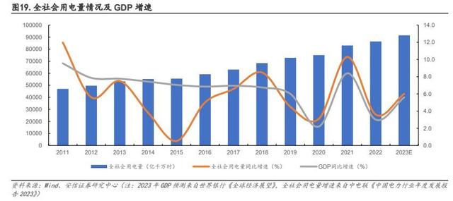 供給側(cè)改革“后遺癥”顯現(xiàn),階段性缺電頻發(fā)。2021 年以來的三年里,我國局部地區(qū)出現(xiàn)了電力供應(yīng)偏緊和短暫缺電的情況,先有 2021 年 8-9 月遼寧、吉林、江蘇、浙江、廣東等地相繼發(fā)布有序用電或限電通知,后有 2022 年夏季高溫天氣導(dǎo)致水電供應(yīng)持續(xù)受限,疊加居民用電負荷增加,各地為緩解用電高峰時段供電壓力再次發(fā)布限電通知,其中云南省電解鋁企業(yè)更是在 2022 年 9 月到 2023 年 2 月間三次收到限電通知。背后反映出來的是供給側(cè)改革后煤炭、火電的長期投資萎縮導(dǎo)致的產(chǎn)能不足現(xiàn)象,與此同時 2015 年后我國全社會用電量增速回升,疊加 2022 年極端高溫導(dǎo)致的空調(diào)降溫用電需求激增,電力供需的矛盾逐漸顯現(xiàn)。展望“十四五”后三年,根據(jù)《新形勢下“十四五”后三年中國電力需求形勢研判》(2023年發(fā)表)分析,“十四五”后三年中國用電量仍有較大增長空間,技術(shù)進步、能源轉(zhuǎn)型、電力市場、氣候氣溫等因素對用電增長影響將增強,且最大負荷受產(chǎn)業(yè)結(jié)構(gòu)調(diào)整、空調(diào)與電采暖設(shè)備推廣、氣候氣溫等影響將更為突出,增速將高于用電增速,或進一步增大電力保供壓力。