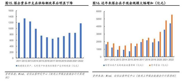 “雙碳”目標(biāo)下,煤企轉(zhuǎn)型具備先天產(chǎn)業(yè)優(yōu)勢、地域優(yōu)勢且資金充足。一方面,煤企具有產(chǎn)業(yè)優(yōu)勢,具備能源開采、裝備制造的成熟經(jīng)驗,擁有穩(wěn)定的下游電廠、化工客源,以及先天地域優(yōu)勢。我國大型新能源項目基地多數(shù)位于西北地區(qū),與煤炭資源分布重合度較高,如我國第一批容量約 1 億千瓦的大型風(fēng)電光伏基地主要位于甘肅、青海、內(nèi)蒙、寧夏等西部地區(qū)。此外,與傳統(tǒng)能源相比,新能源占地面積大。隨著新能源規(guī)模快速擴大,土地資源已經(jīng)成為影響新能源發(fā)展的重要因素,煤炭企業(yè)可利用自有采煤沉陷區(qū)受損土地規(guī)劃建設(shè)光伏發(fā)電、風(fēng)力發(fā)電等新能源項目,提高資源利用率的同時還可實現(xiàn)綠色轉(zhuǎn)型。另一方面,受制于 2011-2013 年行業(yè)產(chǎn)能過剩以及 2016 年以來的供給側(cè)結(jié)構(gòu)性改革,煤炭行業(yè)資本開支明顯下降,2021 年至今雖在行業(yè)景氣度好轉(zhuǎn)以及政策鼓勵保供穩(wěn)價背景下有所回升,但在“雙碳”目標(biāo)持續(xù)推進下,煤炭固定資產(chǎn)投資規(guī)模大、時間長,資本開支仍低于此前水平,且新礦井的使用時間一般長達數(shù)十年之久,長期來看與雙碳背景相違背,企業(yè)進行煤炭固定資產(chǎn)投資的意愿不強。但近兩年煤價高位運行,使得煤炭企業(yè)盈利能力持續(xù)改善,在手現(xiàn)金規(guī)模大幅增加,為后續(xù)轉(zhuǎn)型提供基礎(chǔ)。