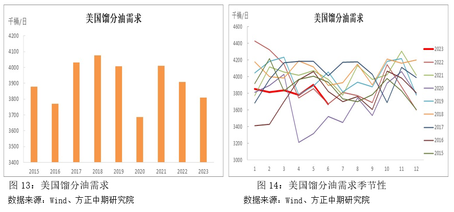 美國(guó)柴油消費(fèi)與美國(guó)制造業(yè)形勢(shì)息息相關(guān),通過(guò)對(duì)比發(fā)現(xiàn),美國(guó)餾分油需求與美國(guó)ISM制造業(yè)PMI趨勢(shì)基本保持一致,但存在滯后關(guān)系。其中,2008年金融危機(jī)以及2020年疫情均導(dǎo)致美國(guó)制造業(yè)PMI大幅下滑,并帶動(dòng)美國(guó)餾分油需求明顯走弱,但2021年美國(guó)制造業(yè)再度進(jìn)入下行周期,2022年美國(guó)餾分油需求也開(kāi)始走弱,2023年美國(guó)餾分油消費(fèi)量達(dá)到381萬(wàn)桶/日,較2022年下降了10萬(wàn)桶/日,較2019年下降了26萬(wàn)桶/日,降幅為6.5%。從歷史數(shù)據(jù)來(lái)看,排除極端情況,美國(guó)制造業(yè)變化往往要領(lǐng)先于美國(guó)餾分油需求變化近1年時(shí)間。