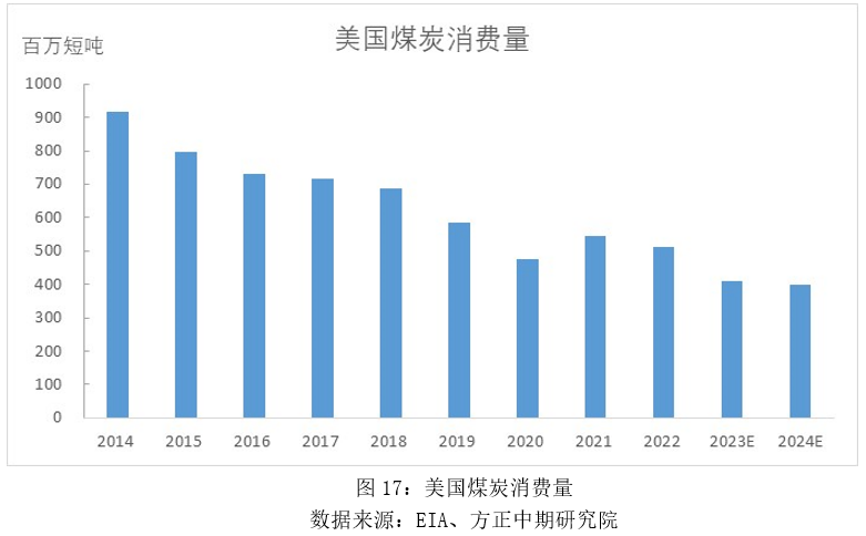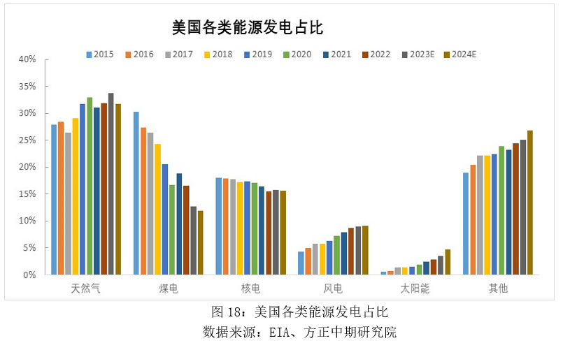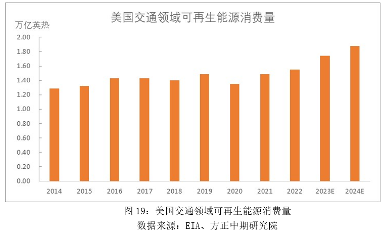 在美國(guó)發(fā)電領(lǐng)域,天然氣發(fā)電占比最大,且相對(duì)穩(wěn)定,過(guò)去幾年占比基本維持在30%左右。而煤炭發(fā)電的占比呈現(xiàn)逐年遞減趨勢(shì),從2015年的30%降至2022年的17%,預(yù)計(jì)到2024年將下降至12%左右。與此同時(shí),風(fēng)電、太陽(yáng)能發(fā)電占比均在逐年提升。而美國(guó)新型能源對(duì)石油的替代主要發(fā)生在交通領(lǐng)域,2021年以來(lái),美國(guó)交通領(lǐng)域可再生能源消費(fèi)量整體呈現(xiàn)明顯的遞增趨勢(shì),2022年美國(guó)交通領(lǐng)域可再生能源消費(fèi)量達(dá)到1.55萬(wàn)億英熱,預(yù)計(jì)2024年將達(dá)到1.88萬(wàn)億英熱,較2020年將增長(zhǎng)40%,可再生能源消費(fèi)的持續(xù)增長(zhǎng)將對(duì)石油需求形成進(jìn)一步替代。