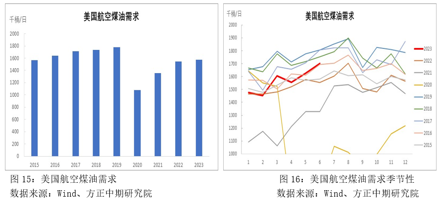美國(guó)航空煤油消費(fèi)與美國(guó)航空業(yè)景氣度有緊密聯(lián)系。美國(guó)航空股ETF一定程度上能反應(yīng)美國(guó)航空業(yè)景氣度,2020年疫情導(dǎo)致航空出行需求驟降,美國(guó)航空業(yè)遭遇重挫,航空股ETF大幅走跌,相應(yīng)的,美國(guó)航空煤油消費(fèi)也顯著下降,而隨著美國(guó)出行限制的逐步放松,美國(guó)航空業(yè)景氣度也在逐步回升,進(jìn)而帶動(dòng)美國(guó)航空煤油快速回升,但2021年二季度以后,受經(jīng)濟(jì)環(huán)境低迷影響,美國(guó)航空股ETF再度走跌,直至2022年9月份才觸底回升,而在過(guò)去1年,美國(guó)航空煤油消費(fèi)整體也隨著美國(guó)航空業(yè)的進(jìn)一步恢復(fù)而走強(qiáng)。另外,我們從OAG的數(shù)據(jù)來(lái)看,當(dāng)前美國(guó)航空運(yùn)力已經(jīng)超過(guò)2019年同期水平約16%,同時(shí)2023年上半年美國(guó)航空實(shí)際客運(yùn)量也已經(jīng)回到疫情前水平,這對(duì)美國(guó)航空煤油消費(fèi)形成明顯支撐。2023年上半年美國(guó)航空煤油消費(fèi)量達(dá)到158萬(wàn)桶/日,較2022年小幅增長(zhǎng)了3萬(wàn)桶/日,但較2019年下降了20萬(wàn)桶/日,降幅為11%。