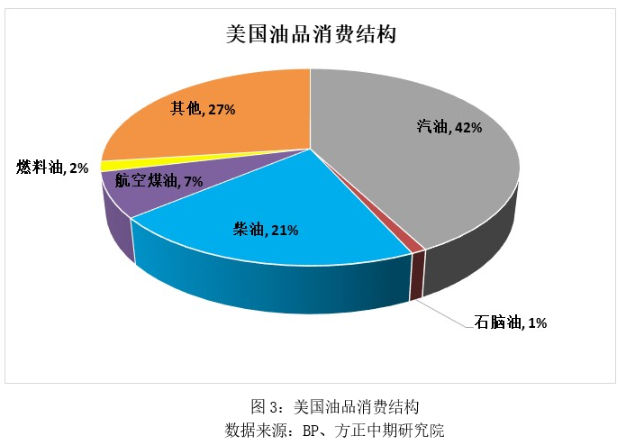美國(guó)是全球第一大石油消費(fèi)國(guó),根據(jù)BP的數(shù)據(jù),2005年美國(guó)石油消費(fèi)達(dá)到2053萬(wàn)桶/日的峰值水平,此后石油消費(fèi)量呈下滑趨勢(shì),即便2012年之后的7年時(shí)間再度出現(xiàn)增長(zhǎng),但仍未超過(guò)2005年的峰值水平。而美國(guó)石油消費(fèi)在全球石油消費(fèi)總量中占比達(dá)到20%左右,而在美國(guó)石油消費(fèi)結(jié)構(gòu)中,汽油消費(fèi)占比最多,達(dá)到42%左右,其次是柴油和航空煤油,占比分別為21%和7%左右,但隨著美國(guó)人均汽車保有量的逐步飽和以及新能源汽車的進(jìn)一步發(fā)展,美國(guó)汽油消費(fèi)占比預(yù)計(jì)將延續(xù)下滑趨勢(shì)。