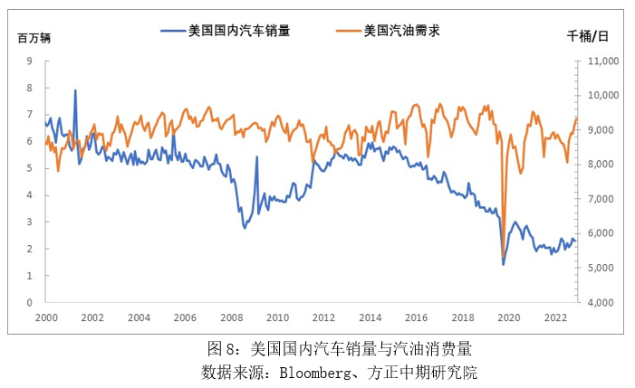 美國(guó)汽油消費(fèi)與美國(guó)汽車保有量及國(guó)內(nèi)汽車銷量的變化有直接關(guān)系,同時(shí)汽車銷售增量相應(yīng)領(lǐng)先于汽油需求增長(zhǎng)。2000年以后,美國(guó)國(guó)內(nèi)汽車銷量呈現(xiàn)明顯的下滑趨勢(shì),至2009年達(dá)到歷史低點(diǎn),此后保持增長(zhǎng)直至2014年,2015年以后美國(guó)汽車銷量再度出現(xiàn)下降,至今仍處在歷史低位水平。相應(yīng)的,美國(guó)汽油需求在2007年以后開(kāi)始下降,但隨著此后汽車銷量的增加,2012年以后美國(guó)汽油需求再度出現(xiàn)增長(zhǎng),但伴隨著美國(guó)汽車銷量的再度下降,在2017年年中美國(guó)汽油消費(fèi)達(dá)到峰值水平后,開(kāi)啟了緩慢下降趨勢(shì)。2023年上半年美國(guó)汽油消費(fèi)量達(dá)到884萬(wàn)桶/日,較2022年小幅增長(zhǎng)了14萬(wàn)桶/日,但較2019年下降了50萬(wàn)桶/日,降幅為5%。