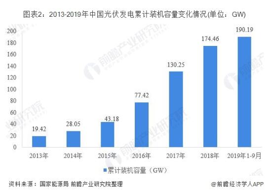 累計(jì)裝機(jī)容量方面,據(jù)國(guó)家能源局統(tǒng)計(jì)數(shù)據(jù)顯示,2013年以來(lái),我國(guó)光伏發(fā)電累計(jì)裝機(jī)容量增長(zhǎng)迅速。2013年,全國(guó)光伏發(fā)電累計(jì)裝機(jī)容量?jī)H為19.42GW,到2018年已經(jīng)增長(zhǎng)至174.46GW。預(yù)計(jì)2013-2019年,全國(guó)光伏發(fā)電累計(jì)裝機(jī)容量將有近10倍增長(zhǎng)。截至2019年9月底,全國(guó)光伏發(fā)電累計(jì)裝機(jī)190.19GW,同比增長(zhǎng)15%。