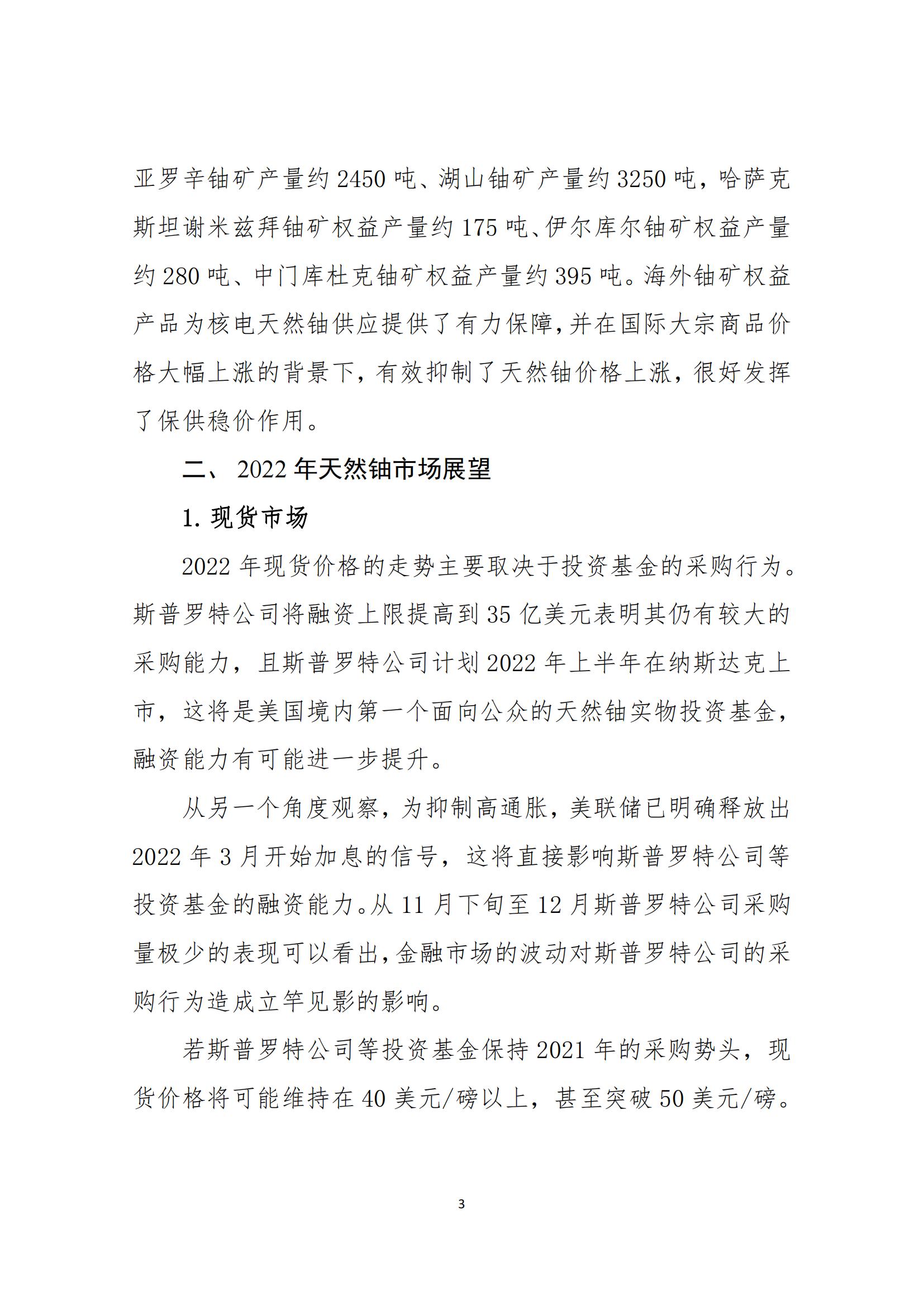 對(duì)2022年天然鈾市場(chǎng)的情況,報(bào)告作了如下展望?,F(xiàn)貨市場(chǎng)方面,2022年現(xiàn)貨價(jià)格的走勢(shì)主要取決于投資基金的采購(gòu)行為。美聯(lián)儲(chǔ)已明確釋放出2022年3月開(kāi)始加息的信號(hào),若斯普羅特公司等投資基金保持2021年的采購(gòu)勢(shì)頭,現(xiàn)貨價(jià)格將可能維持在40美元/磅以上,甚至突破50美元/磅;若投資基金減少采購(gòu)規(guī)?;蚍啪彶少?gòu)節(jié)奏,價(jià)格將可能回到35-40美元/磅區(qū)間;若投資基金完全停止采購(gòu),價(jià)格將可能回到30-35美元/磅區(qū)間。長(zhǎng)貿(mào)市場(chǎng)方面,長(zhǎng)貿(mào)價(jià)格將繼續(xù)受現(xiàn)貨價(jià)格影響,綜合判斷,40-45美元/磅屬于高位區(qū)間,35-40美元/磅屬于正常區(qū)間,30-35美元/磅屬于低位區(qū)間。