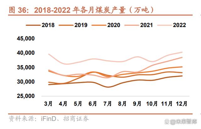 在保供政策的支持下,2022 年國內(nèi)煤炭供應(yīng)在進(jìn)口煤炭價(jià)格暴漲的情況下基本維持穩(wěn)定。2022 年,全國煤炭產(chǎn)量 45.6 億噸,同比增長 10.6%,比去年增加 4.4 億噸,創(chuàng)歷史新高。2022 年各個(gè)月煤炭產(chǎn)量在近五年均為最高。進(jìn)口 煤炭 2.93 億噸,同比增長 43.34%,其中 8-12 月份煤炭進(jìn)口量遠(yuǎn)高于往年同期水平。庫存方面,2022 年全國煤炭庫 存由 1 月的 1945 萬噸增長到年末的 2057 萬噸,增長 5.7%。港口庫存上,秦皇島港、黃驊港煤炭庫存 2022 年內(nèi)均 有上升,其中秦皇島港年內(nèi)最高庫存達(dá)到 592 萬噸,相較于年初增長 31.8%。內(nèi)陸省份上,東北、華東、西南、西北 煤炭庫存在年內(nèi)均有上漲,六大發(fā)電集團(tuán)(國家電投、華能集團(tuán)、國家能源集團(tuán)、華電集團(tuán)、大唐集團(tuán)、三峽集團(tuán)) 煤炭庫存在年末達(dá)到 1206.8 萬噸,較年初增長 3.8%。