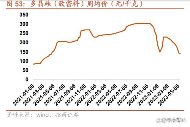 硅料價格持續(xù)下降,新建產(chǎn)能規(guī)模龐大,有望推動光伏裝機進一步增長。2022 年 12 月開始,隨著硅料產(chǎn)能的逐步釋 放,多晶硅和組件價格開始大幅回落。2023 年 2 月,硅料價格出現(xiàn)輕微反彈,主要系需求回暖+開工補庫所致,目前 已重新進入下行通道。截至 2023 年 5 月 17 日,多晶硅(致密料)價格為 143 元/千克,相較 2022 年 11 月 30 日的 高點 295 元/千克下降 51.53%;單面單晶 PERC 組件價格(182mm)為 1.66 元/瓦,相較 2022 年 11 月 23 日的高 點 1.97 元/瓦下降 15.74%。硅業(yè)分會表示,2023 年國內(nèi)多晶硅產(chǎn)量保守估計有 146 萬噸,加上進口多晶硅可達 156 萬噸,這些硅料已經(jīng)足夠 600GW 光伏裝機,已遠超 2023 年的全球光伏裝機量需求,過剩的產(chǎn)能有望推動硅料和組 件價格進一步下行,提升運營商的裝機意愿。