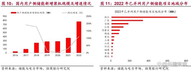 我國工商業(yè)用戶側(cè)儲能起步于 2016 年左右,早期主要依靠國家出臺的相關(guān)支持政策推動,隨著工商業(yè)儲能商業(yè)模式持續(xù)成熟清晰,工商業(yè)用戶側(cè)儲能新增裝機(jī)規(guī)模提速明顯。截至 2022 年,國內(nèi)用戶側(cè)儲能新增裝機(jī)規(guī)模達(dá) 764.73MW,同比增速超過 100%,其中工商業(yè)儲能占用戶側(cè)新增裝機(jī)規(guī)模的 80%-90%左右,并且主要集中在浙江、廣東、安徽、江蘇等地,對于國內(nèi)市場而言預(yù)計未來用戶側(cè)儲能將以工商業(yè)用戶為主,未來空間廣闊。